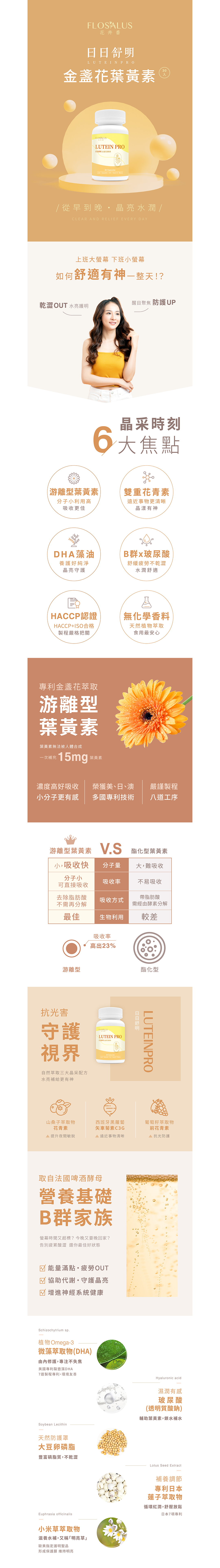 • 游離型葉黃素+玉米黃素,更有效吸收,晶亮更有感
